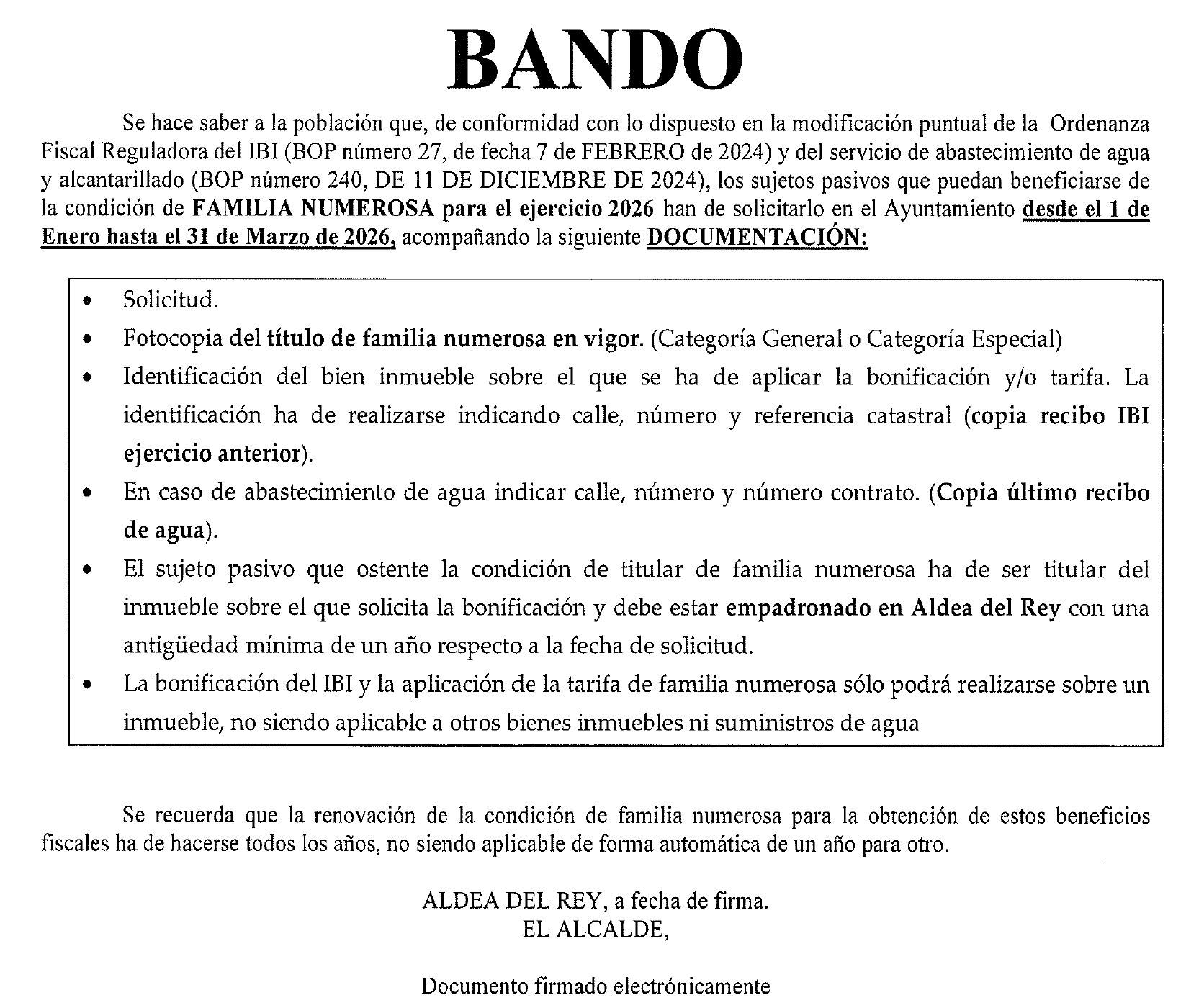 El Ayuntamiento de Aldea del Rey informa a las familias numerosas del municipio sobre la bonificación aplicable al recibo del agua y al Impuesto sobre Bienes Inmuebles (IBI) correspondiente al ejercicio 2026.