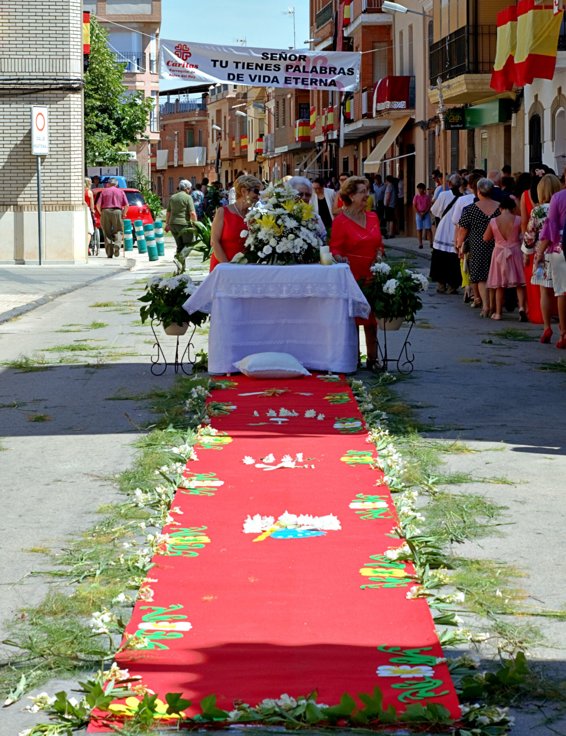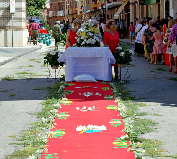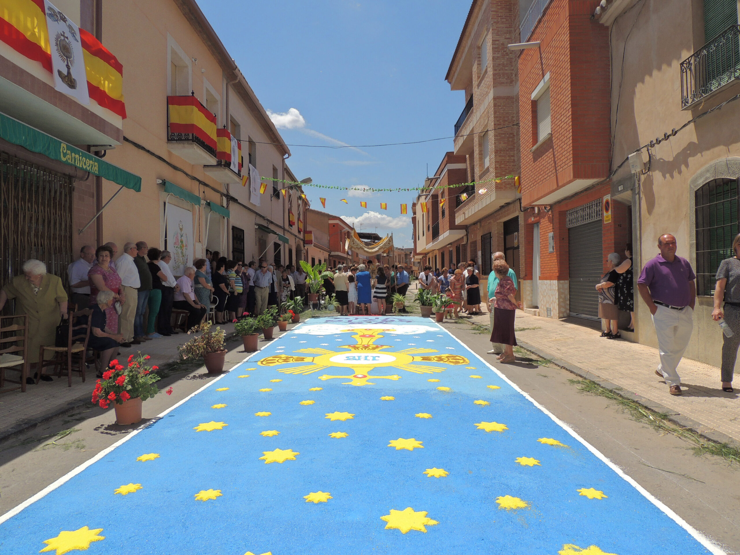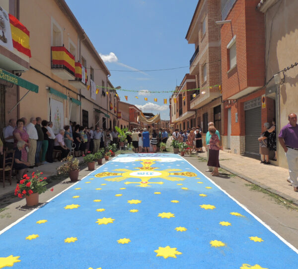 Desde primeras horas de la madrugada, los vecinos y asociaciones locales trabajan con dedicación y esmero para diseñar y confeccionar auténticas obras de arte en el suelo de nuestras calles. Motivos religiosos, eucarísticos y florales se entrelazan en una explosión de color que convierte el recorrido en un verdadero museo al aire libre.