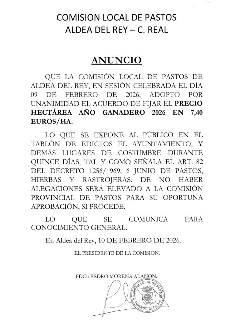 Precios 2026 Comisión Local de Pastos